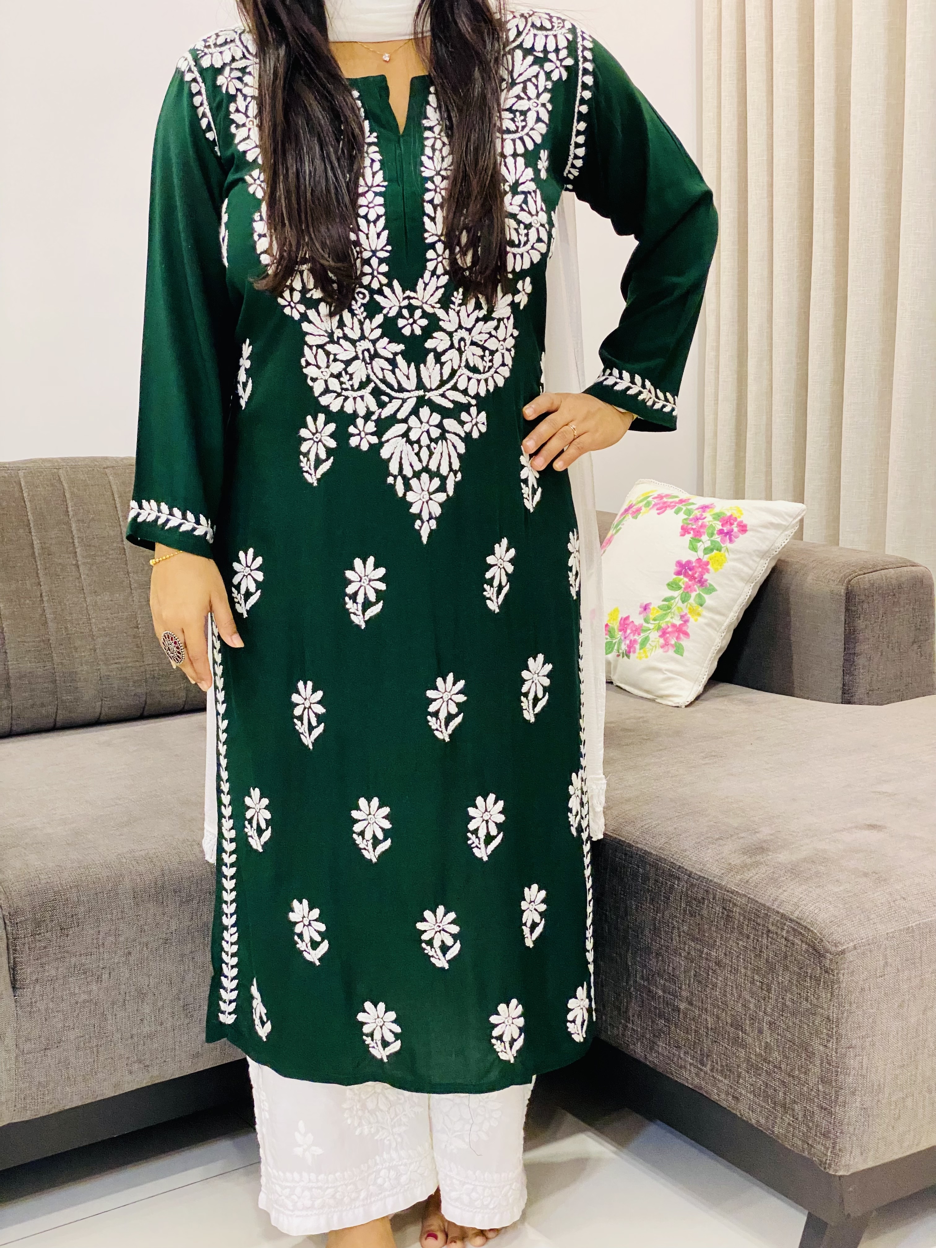 Bottle Green Evana Rayon Chikankari Handwork Women's Solid Long Straight Kurta