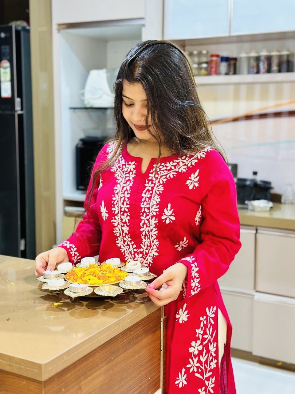 Red Aanvi Cotton Chikankari Women's Solid Long Kurta
