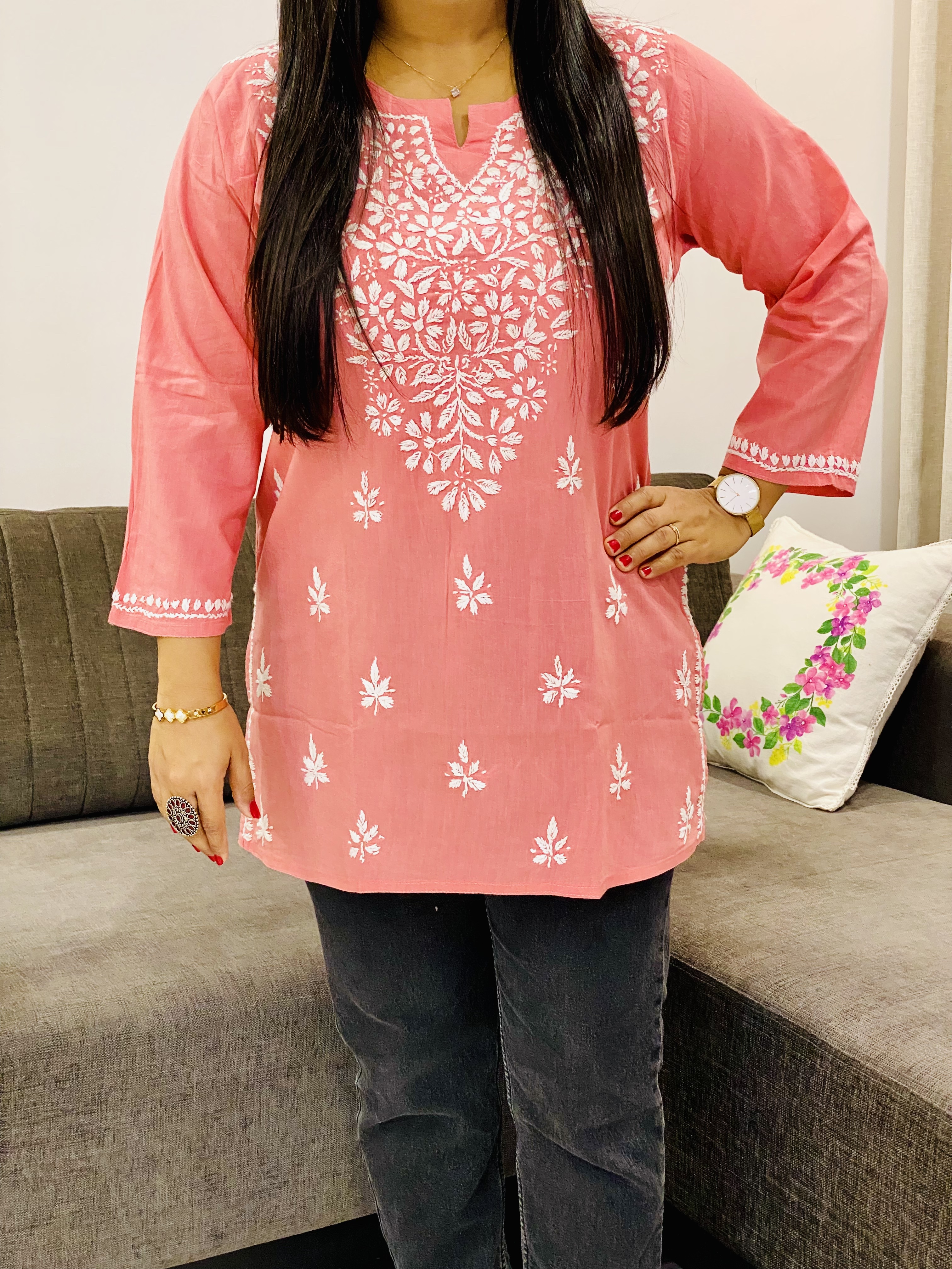 Peach Ekra Cotton Chikankari Hand Embroidered Solid Women's Short Kurta