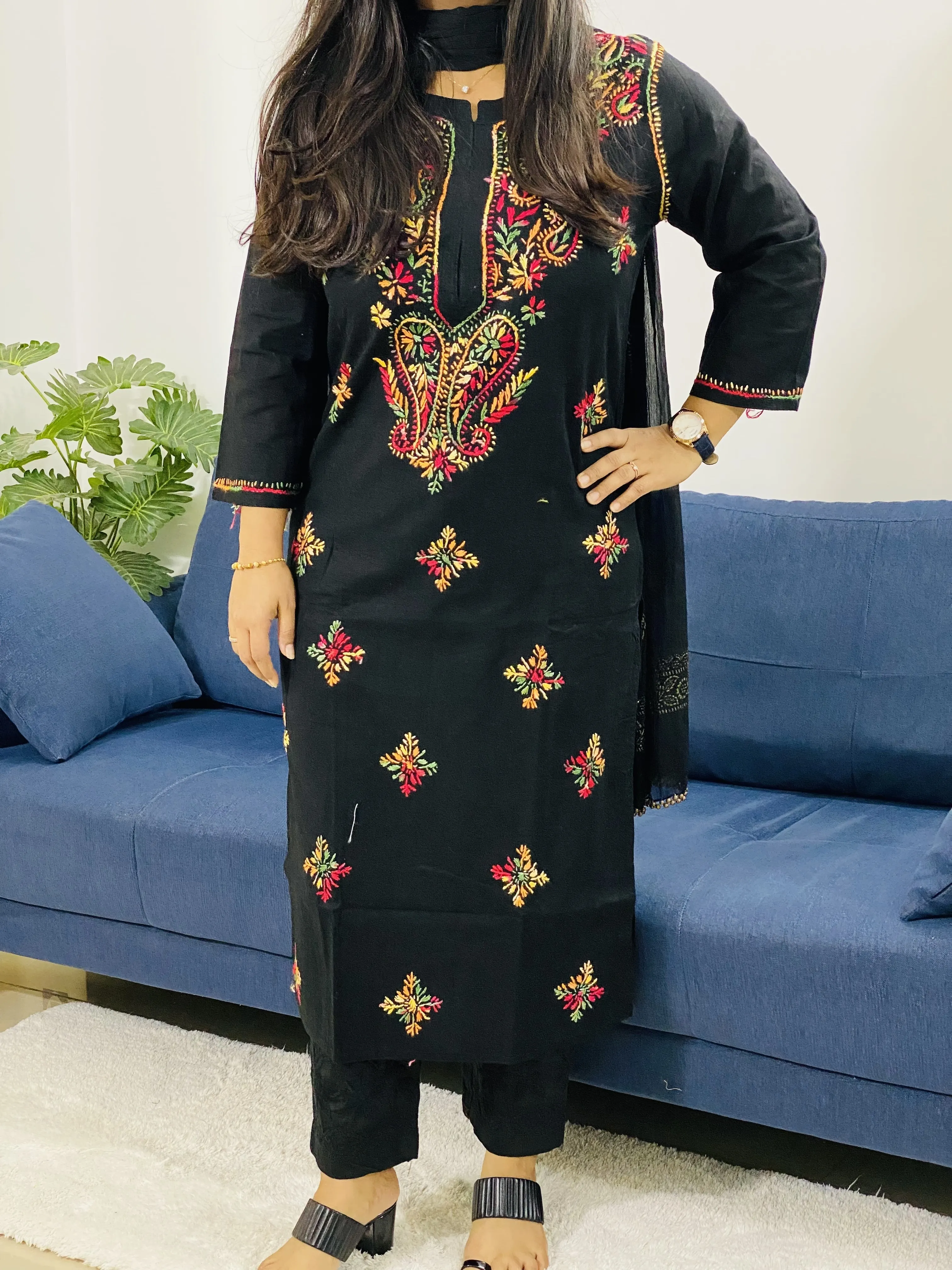 Black Keri Cotton Chikankari Handwork Women's Solid Long Kurti