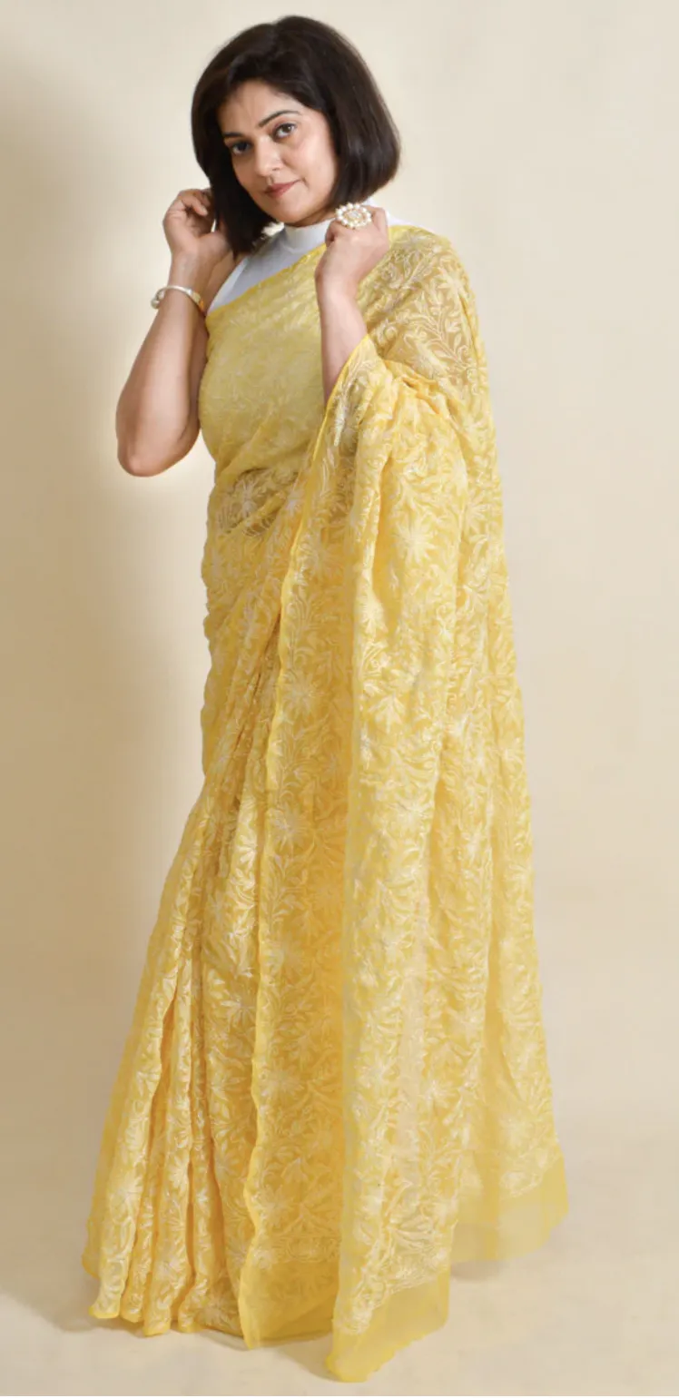 Yellow Hansa Tapchi Chikankari Hand Embroidered Women's Saree