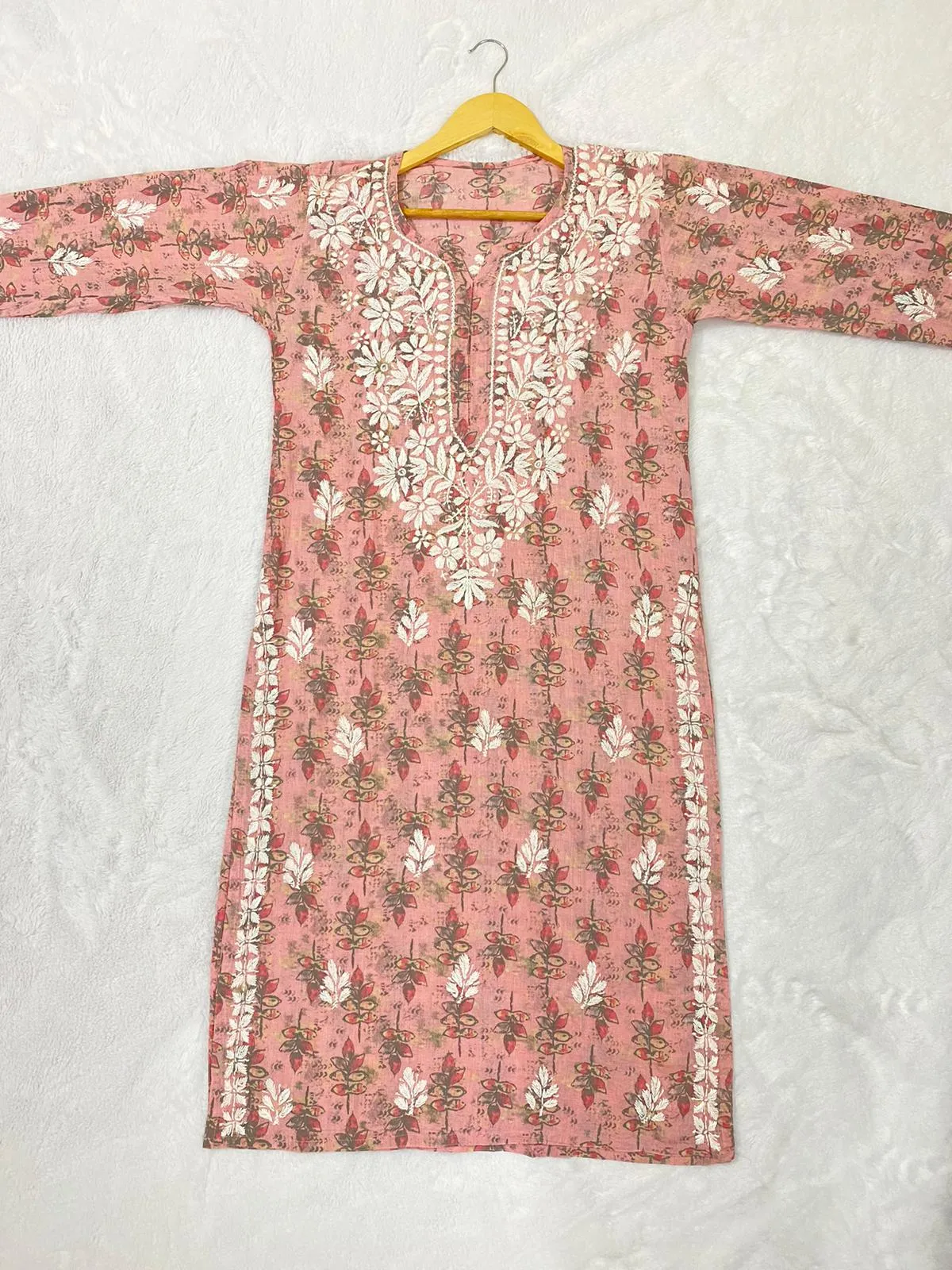 Baby Pink Aadita Cotton Chikankari Hand Embroidered Women's Floral Long Kurta