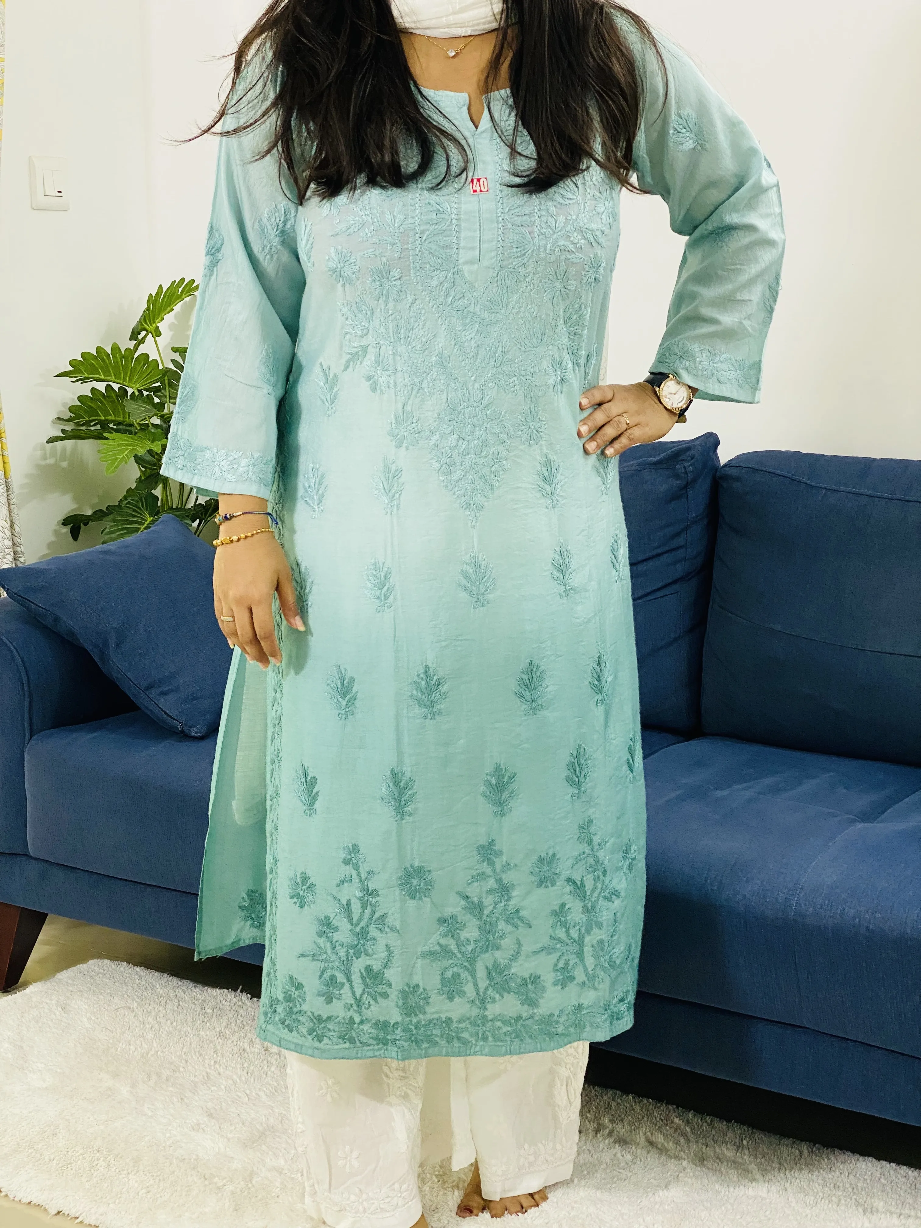English Green Murraya Chanderi Silk Chikankari Hand Embroidered Women's Solid Long Kurta