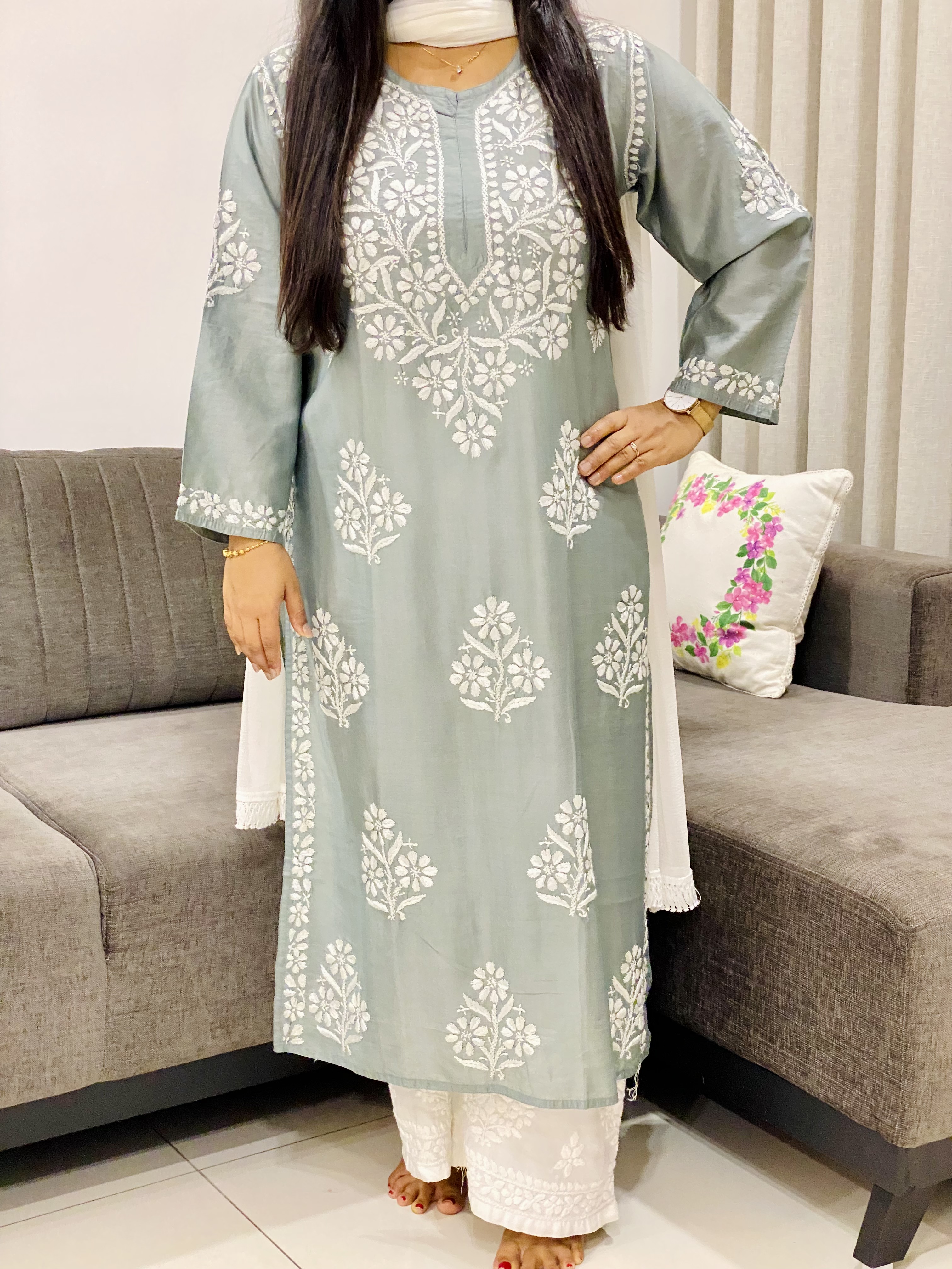 Grey Rida Premium Chanderi Chikankari Hand Embroidered Women's Solid Long Kurta