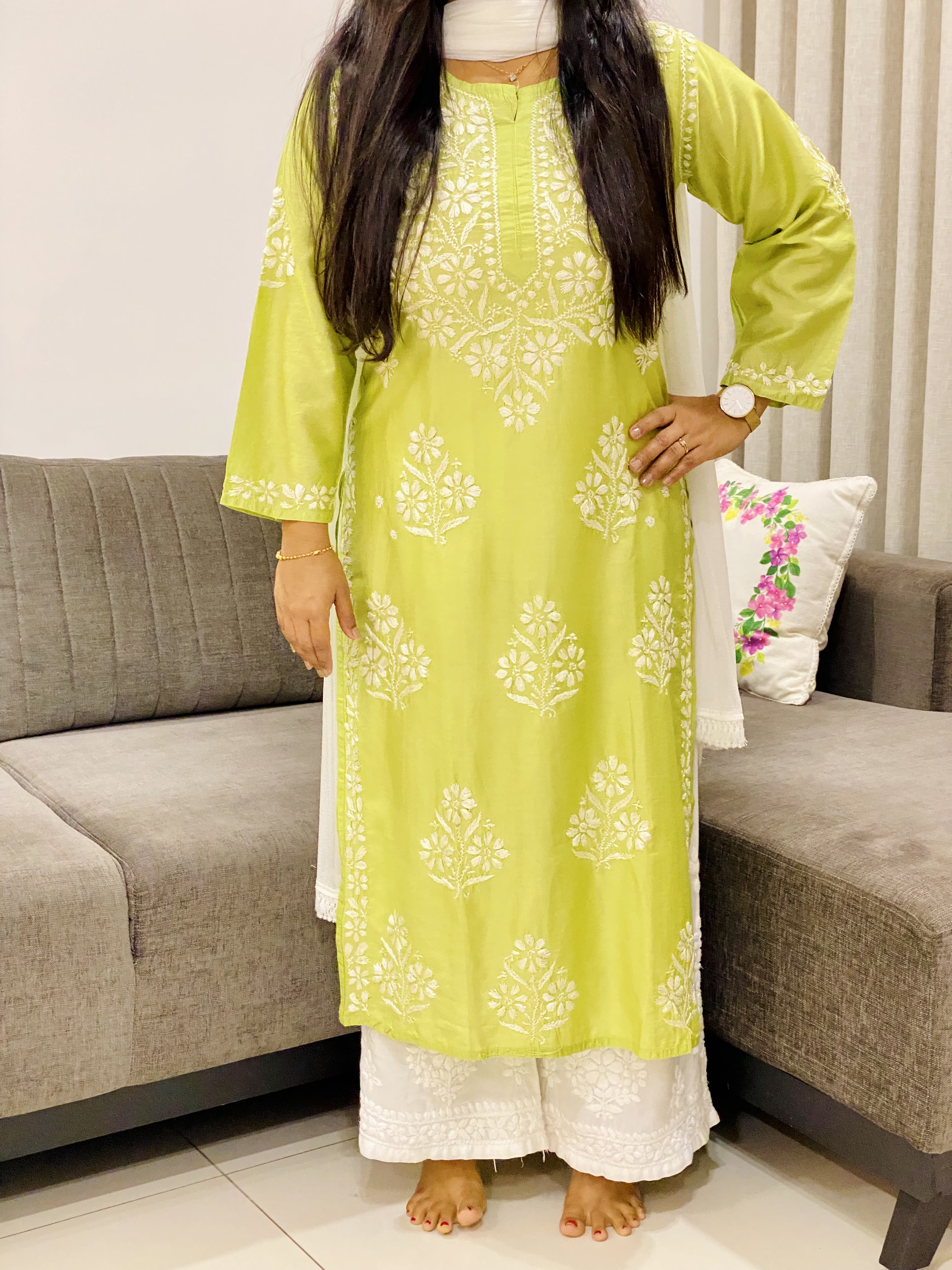 Pista Rida Premium Chanderi Chikankari Hand Embroidered Women's Solid Long Kurta