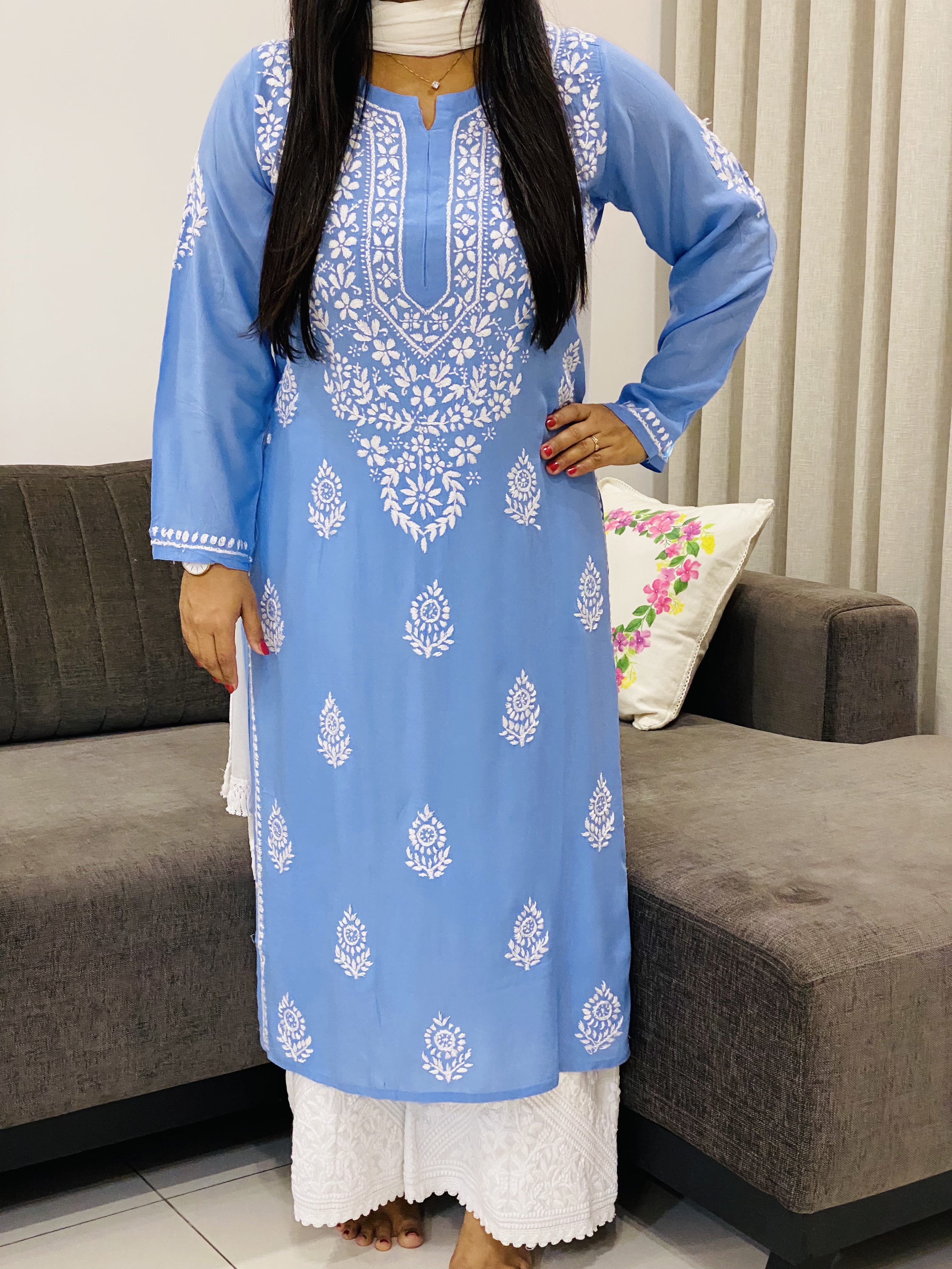 Powder Blue Niya Premium Modal Chikankari Hand Embroidered Solid Women's Long Kurta