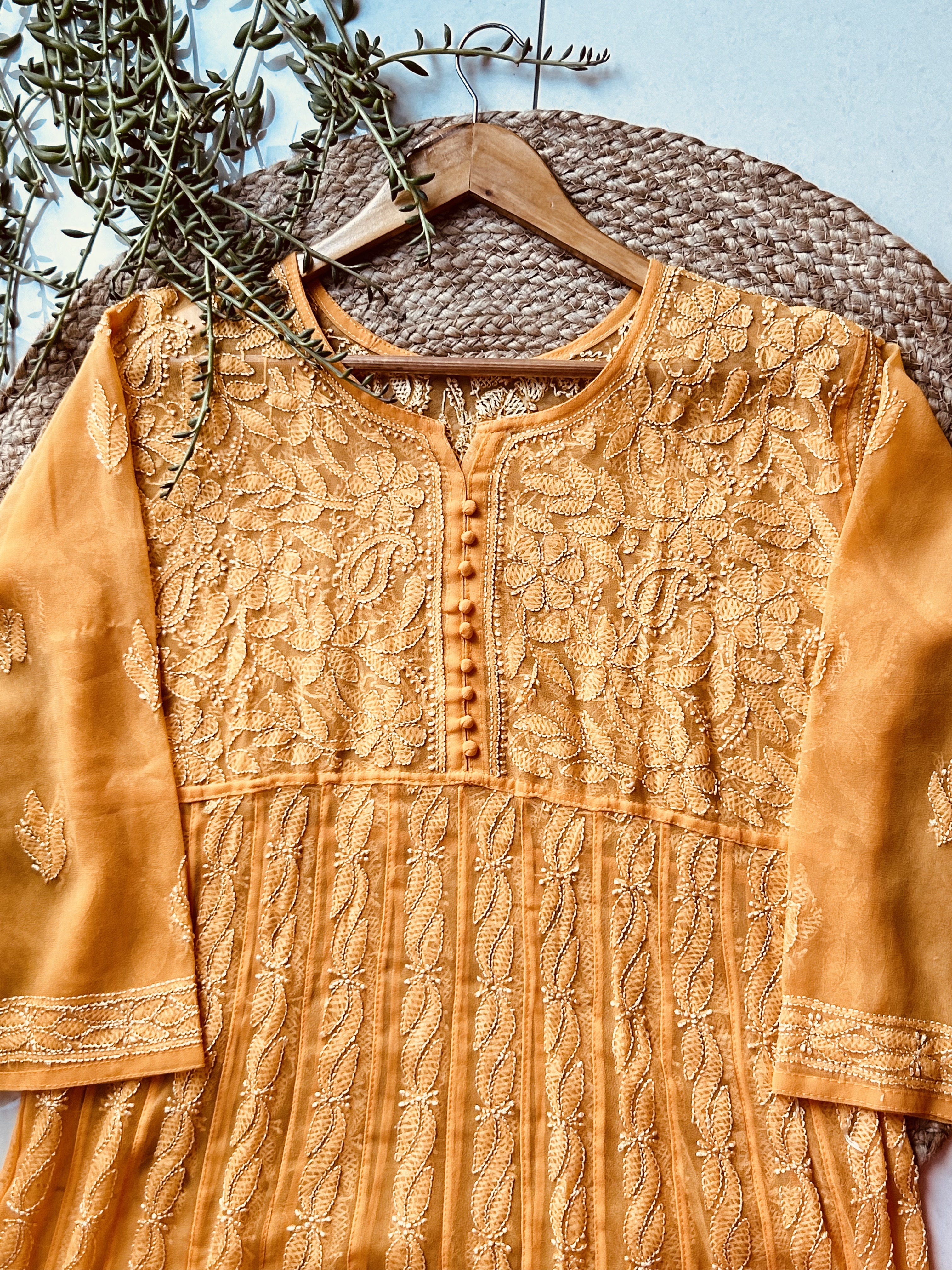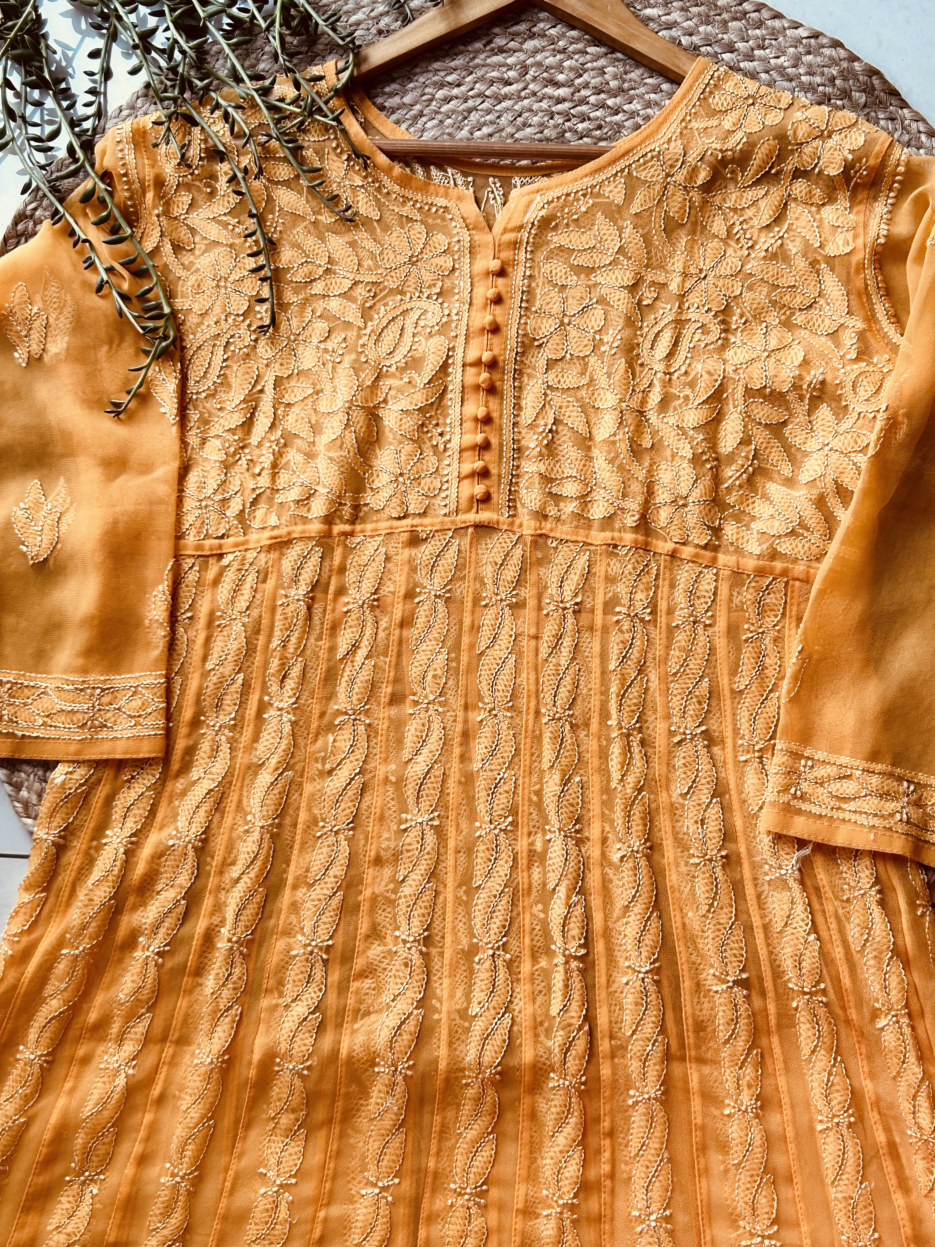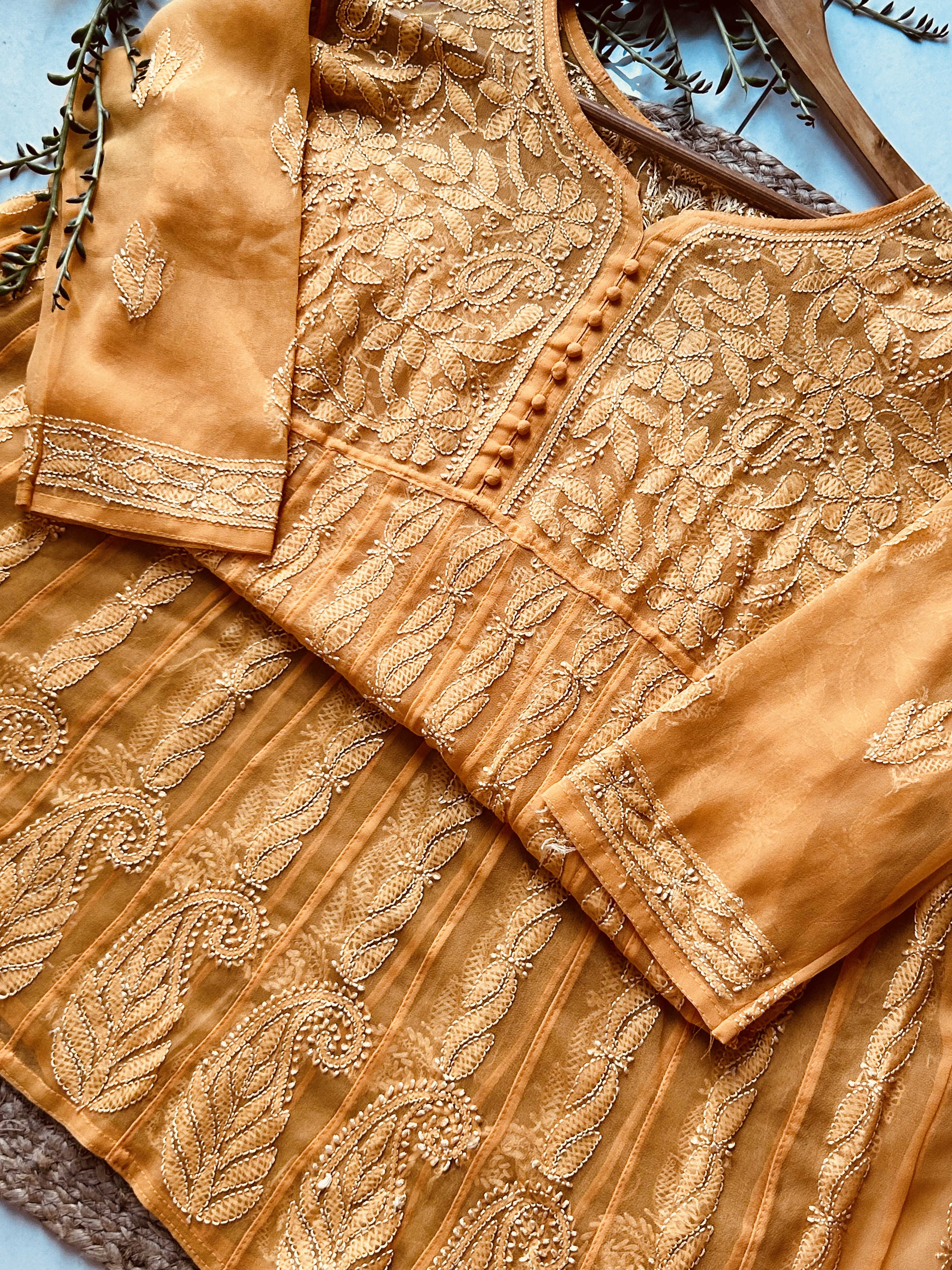 Light Orange Tara Resham Chikankari Hand Embroidered Women's Yog Anarkali Kurta