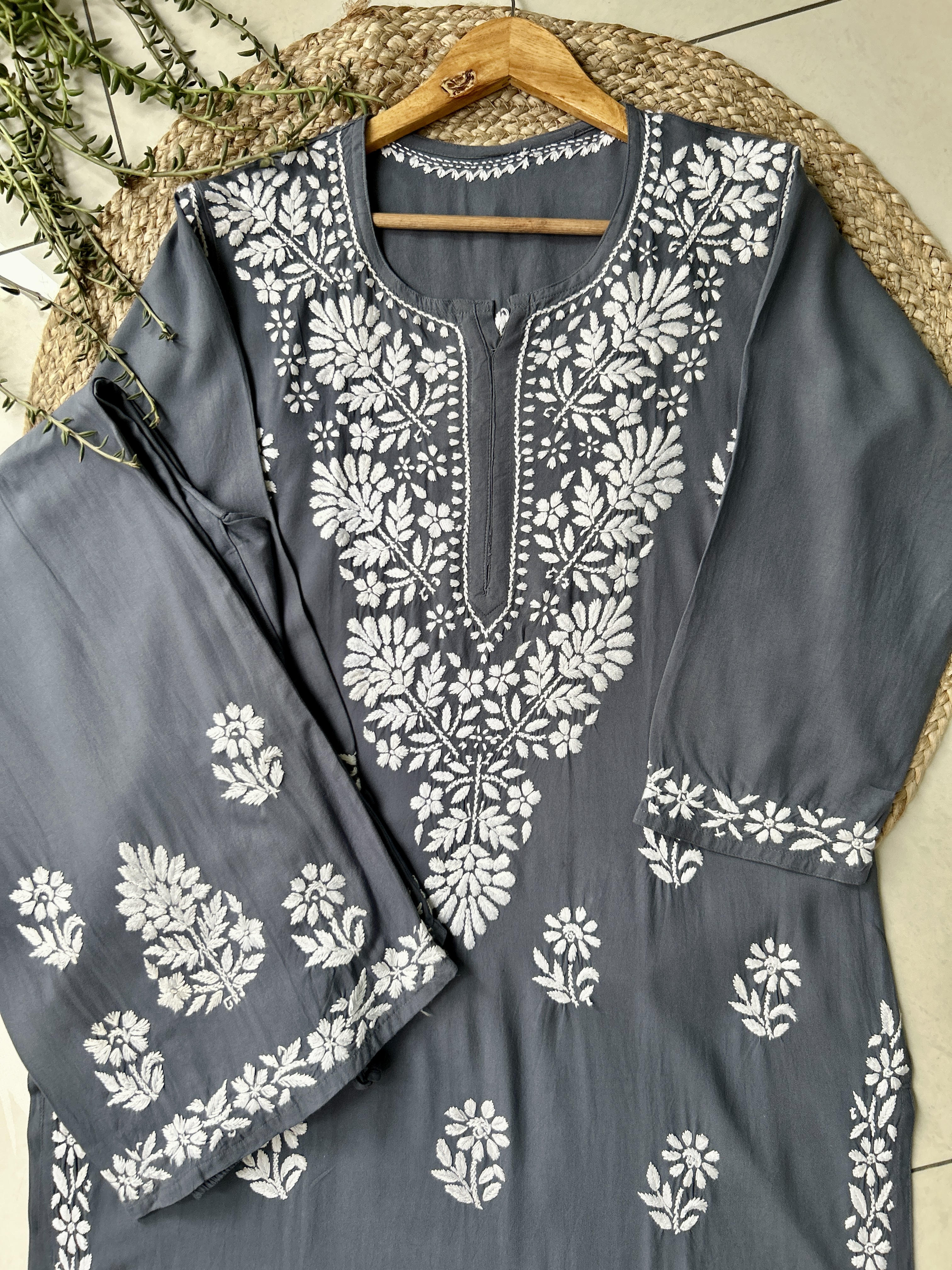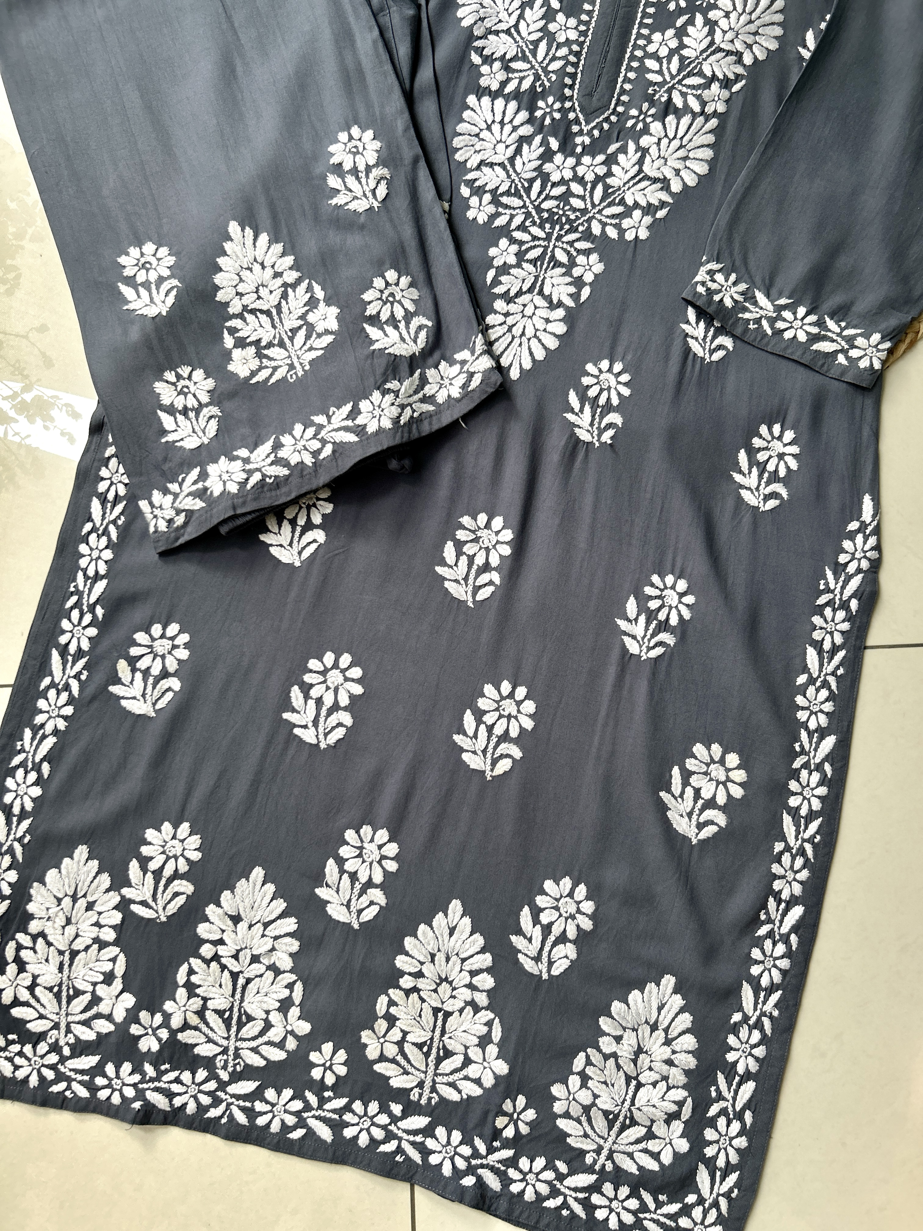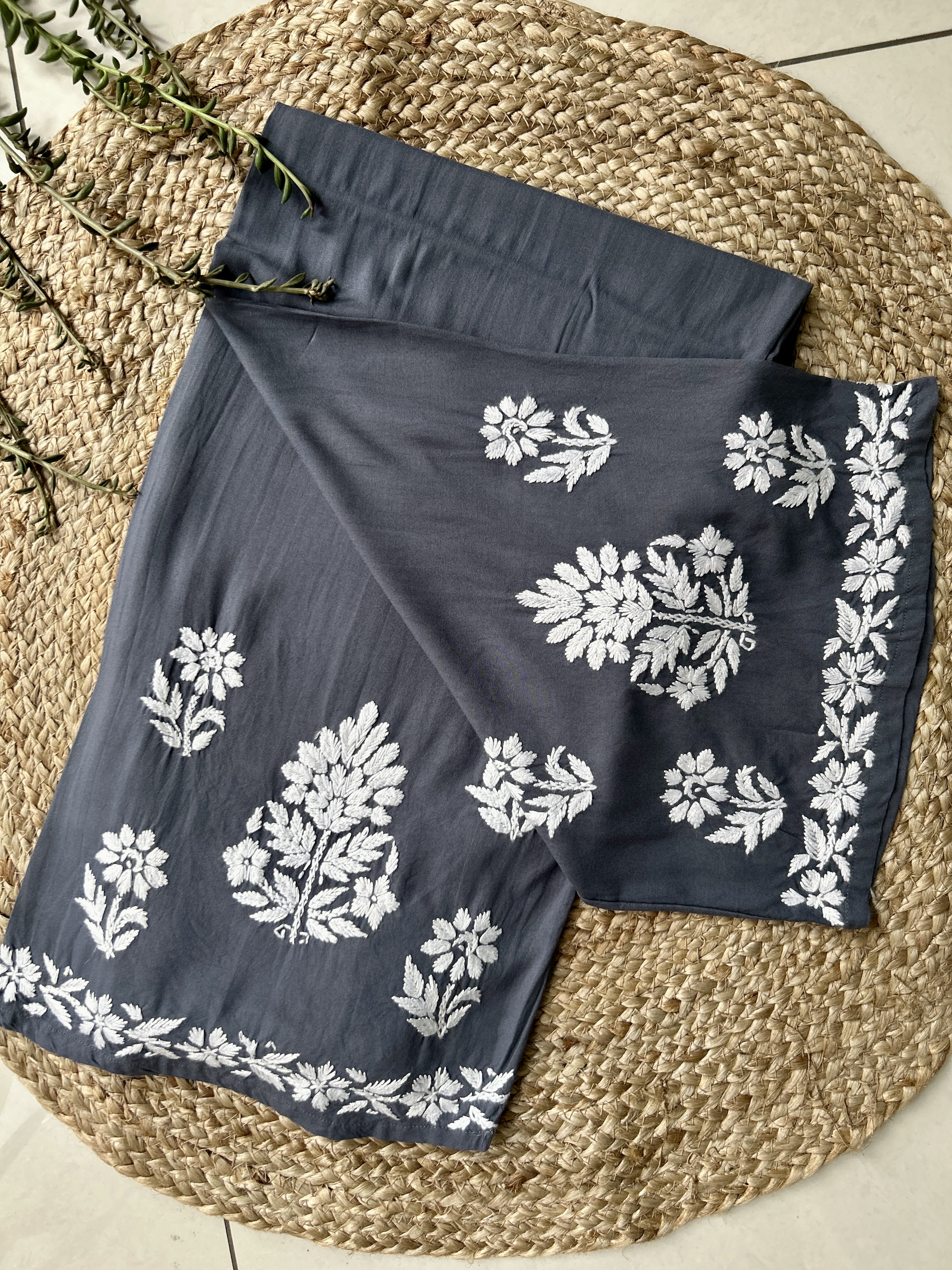 Charcoal Sangriya Rayon Chikankari Handwork women kurta palazzo set