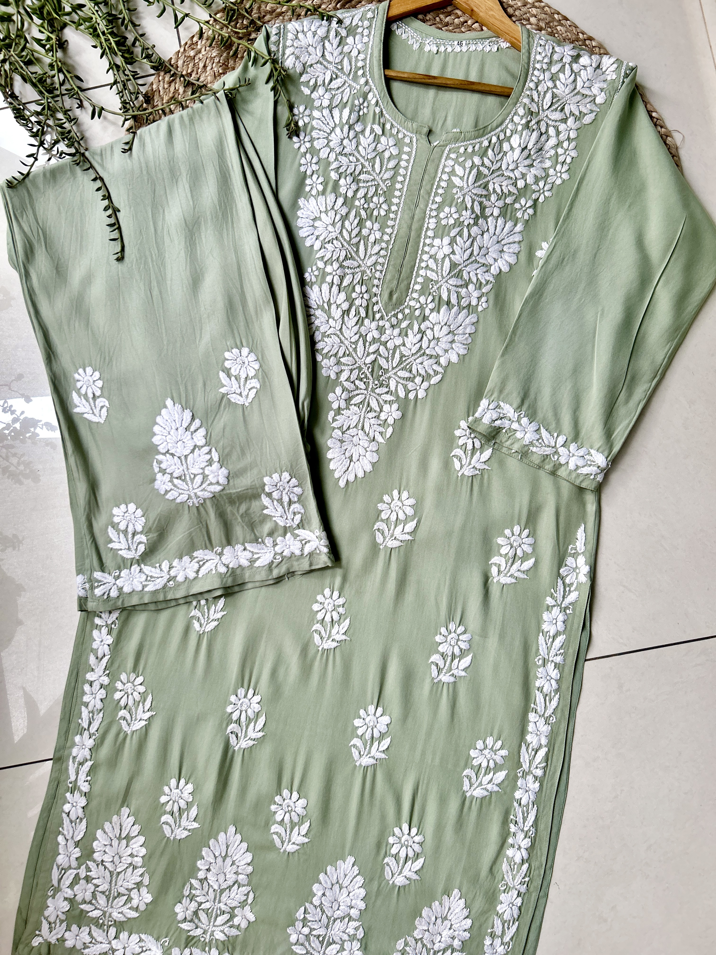 English Green Sangriya Rayon Chikankari Handwork women kurta palazzo set