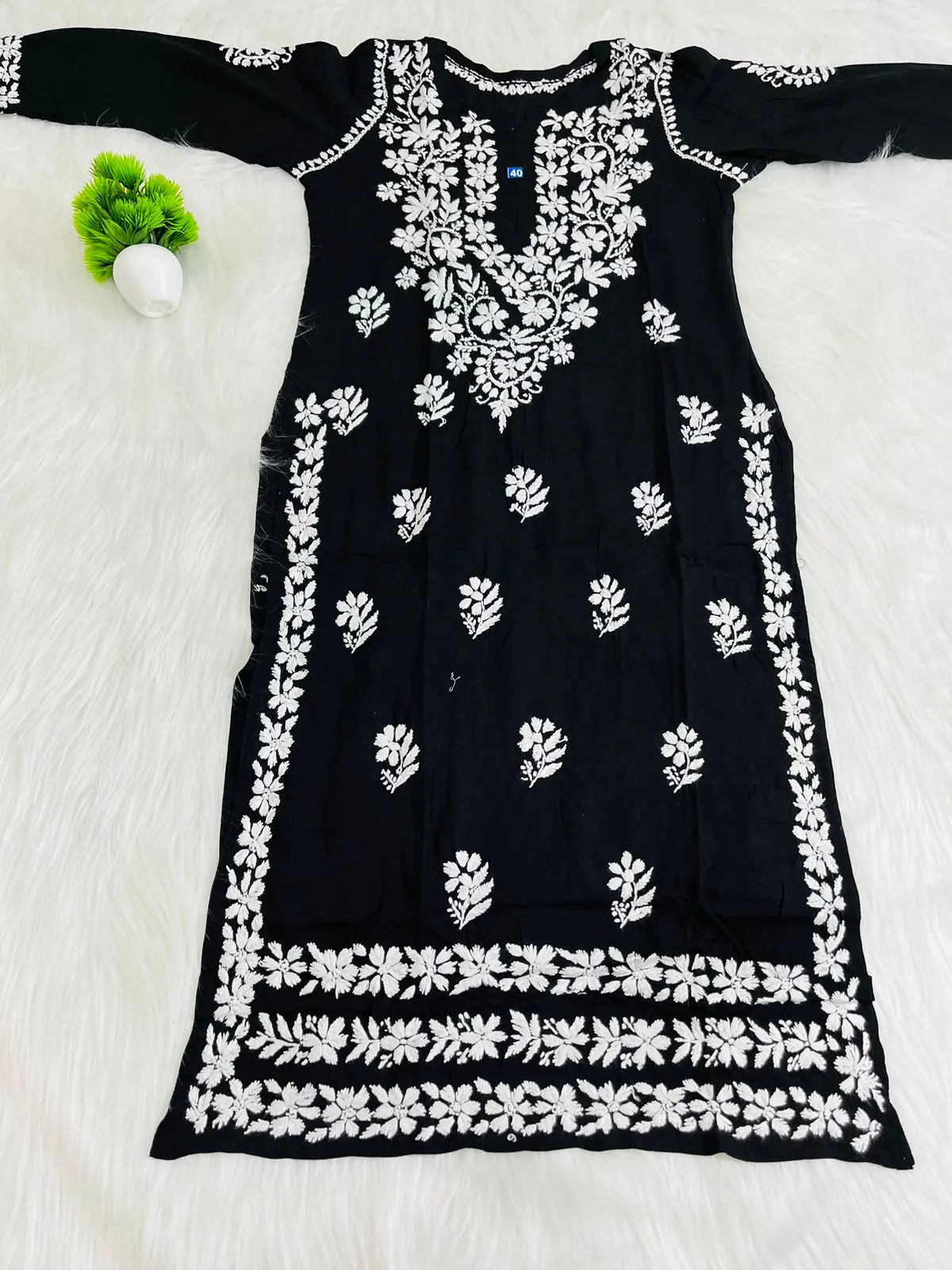 Black Bela Premium Modal Chikankari Hand Embroidered Solid Women's Long Kurta