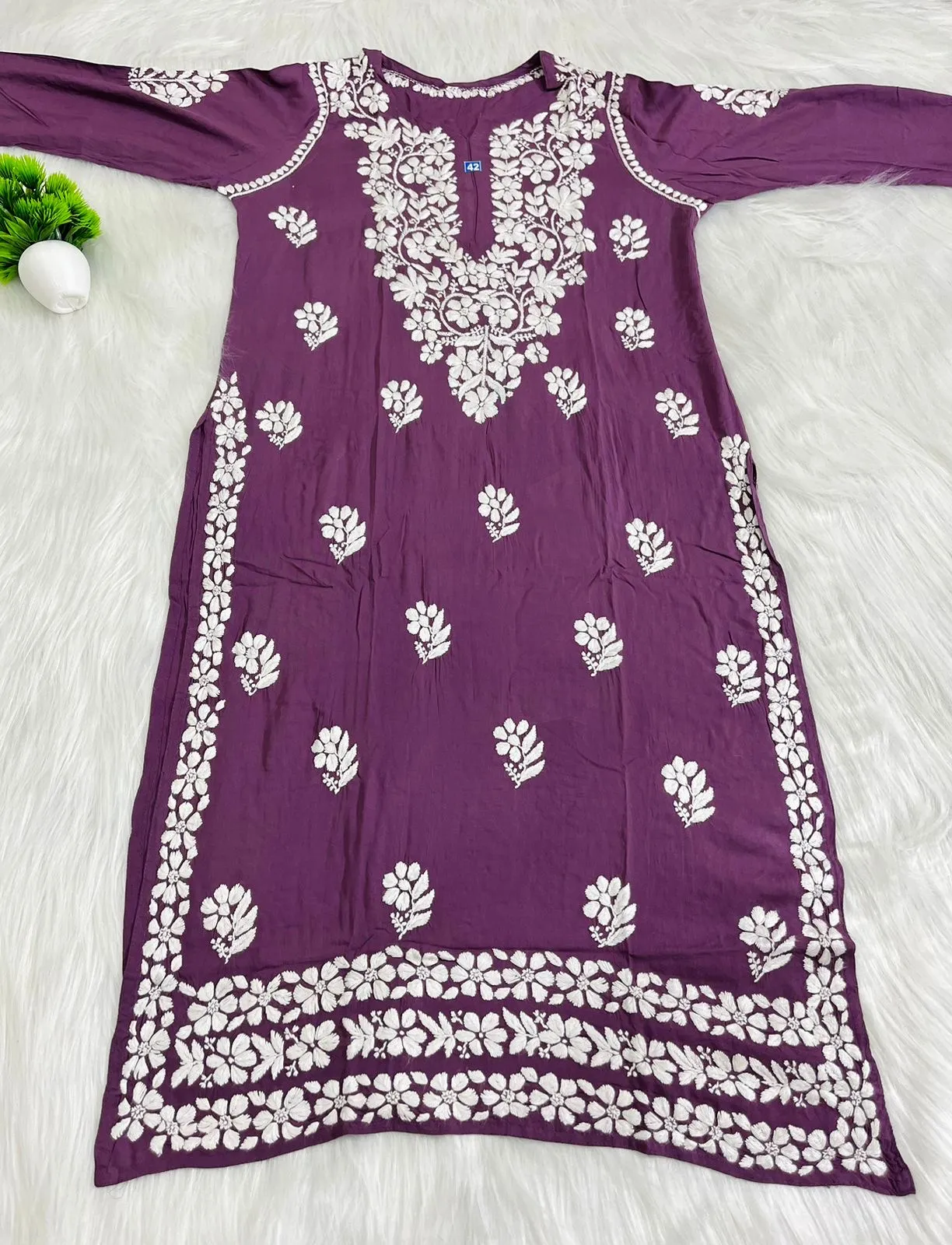 Mauve Bela Premium Modal Chikankari Hand Embroidered Solid Women's Long Kurta