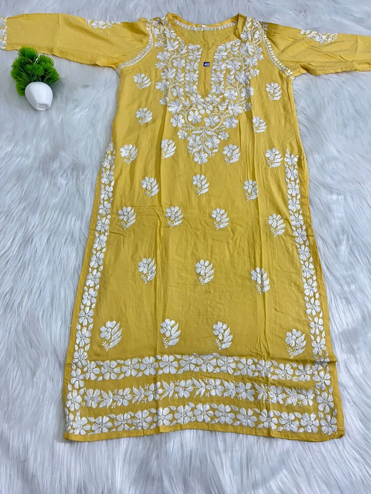Yellow Bela Premium Modal Chikankari Hand Embroidered Solid Women's Long Kurta