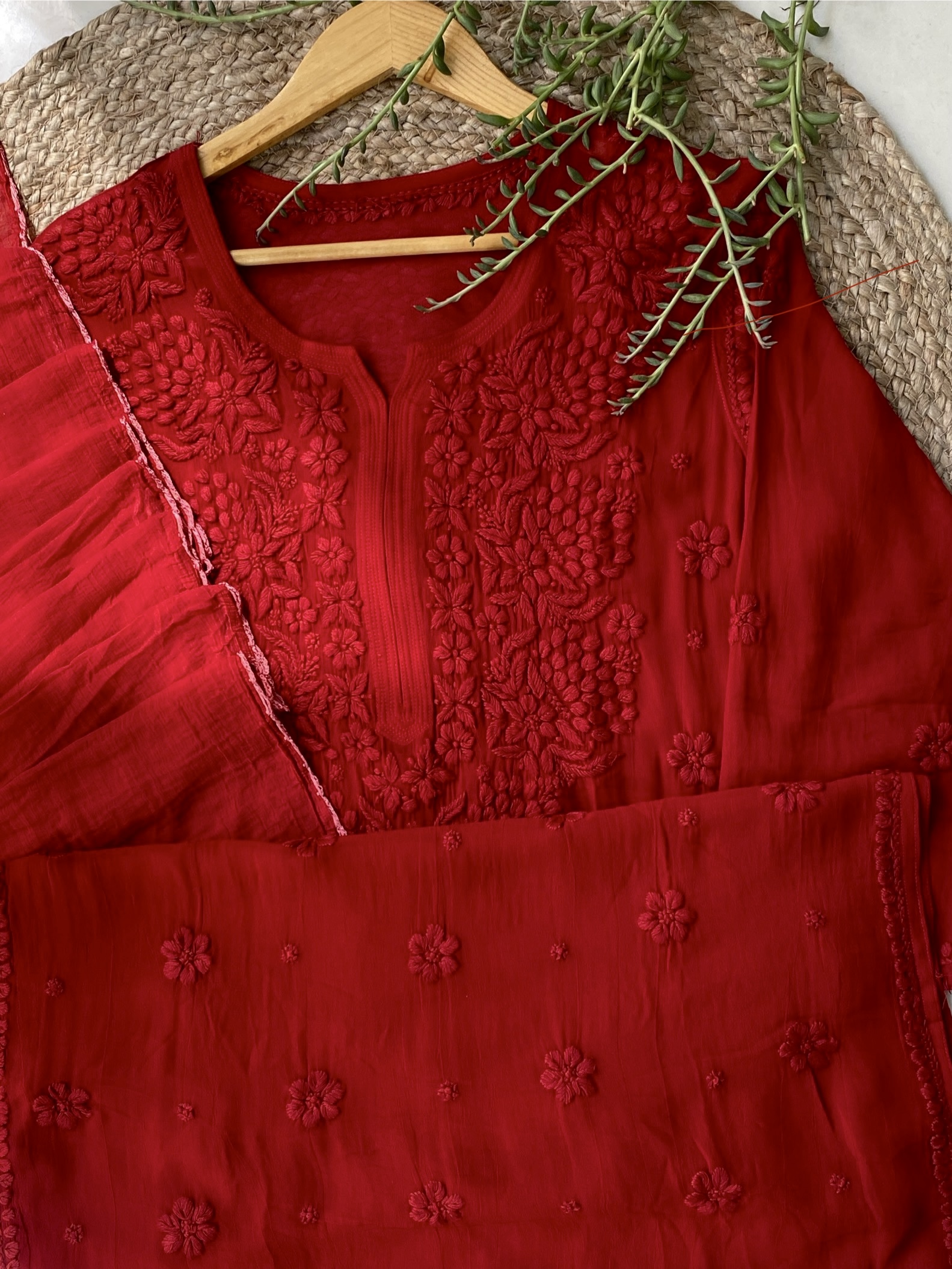 Red Zoya Viscose Chikankari Hand Embroidered Kurta and Dupatta