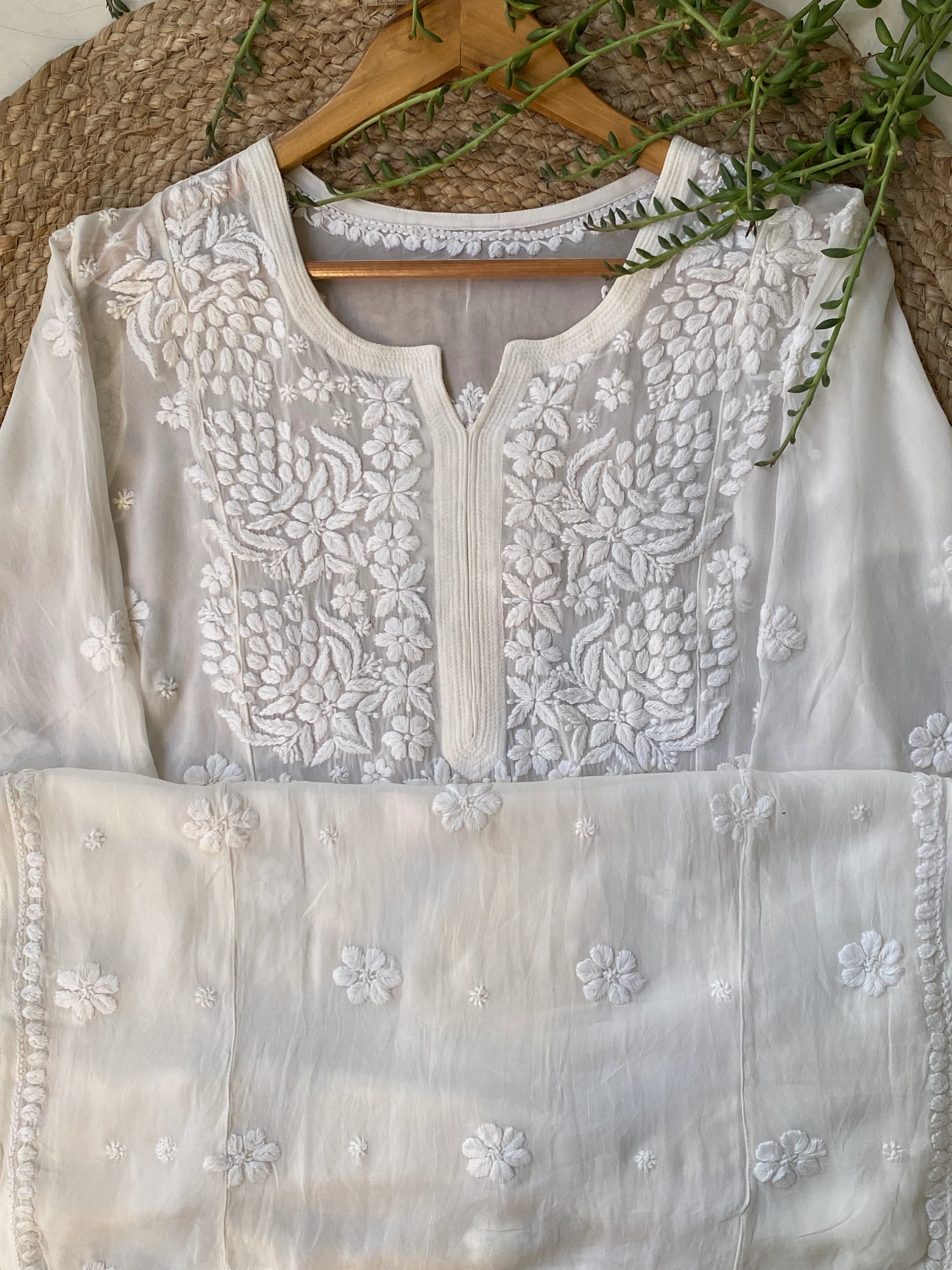 White Zoya Viscose Chikankari Hand Embroidered Kurta and Dupatta