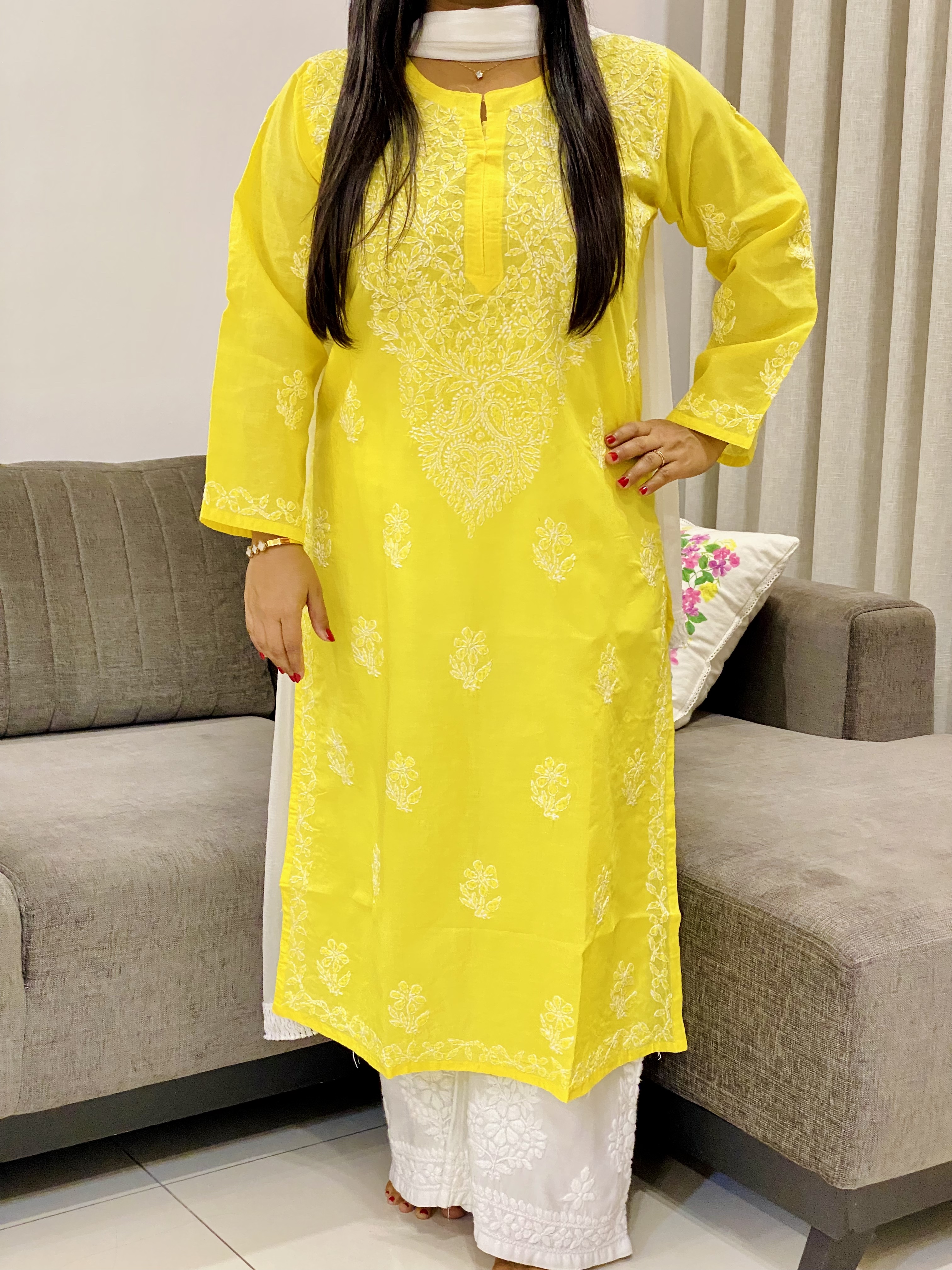 Yellow Bani Voil Cotton Chikankari Hand Embroidered Women's Solid Long Kurta