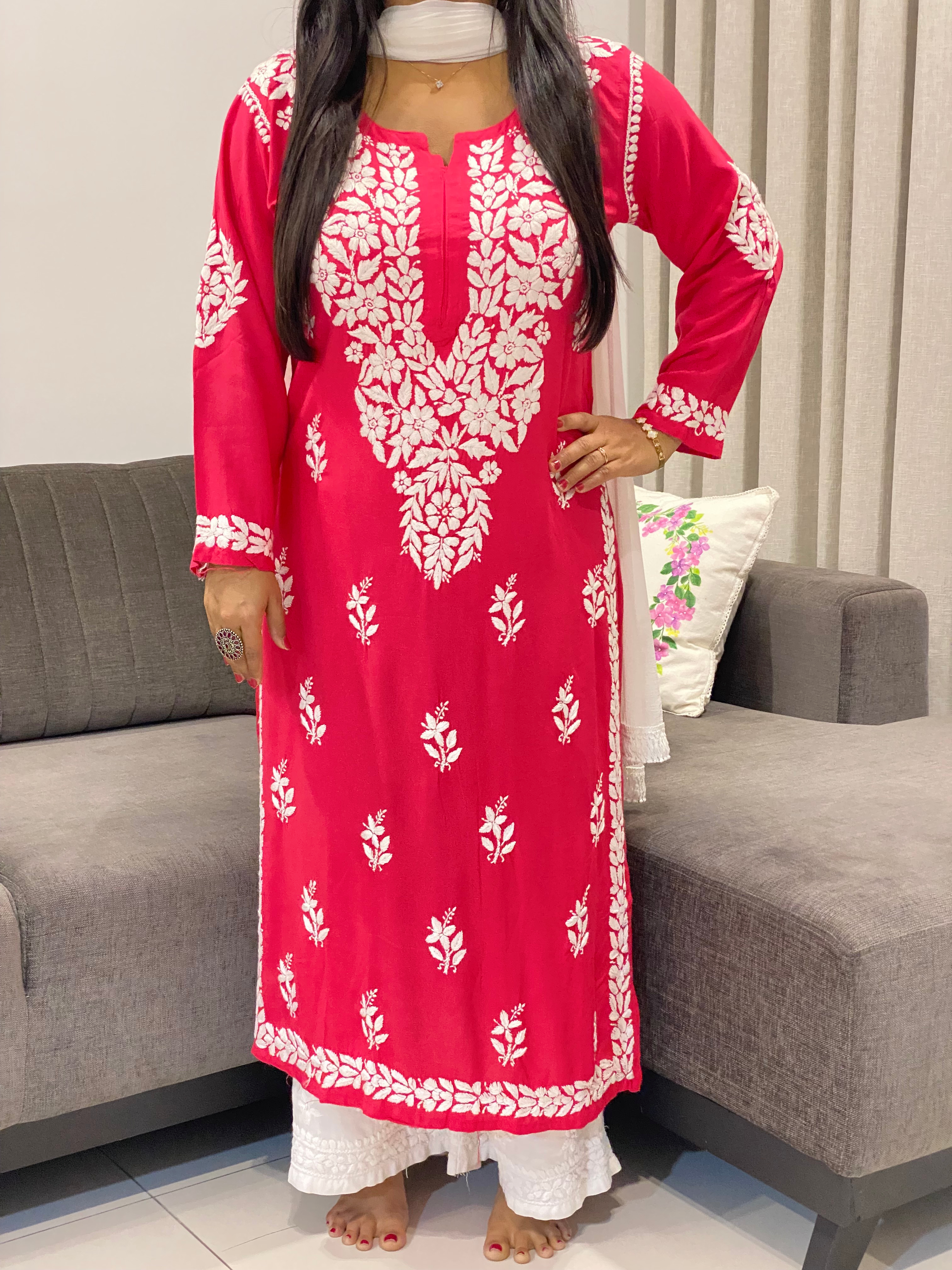 Tomato Pink Falak 3D Chikankari Hand Embroidery Design Rayon Womens Kurta