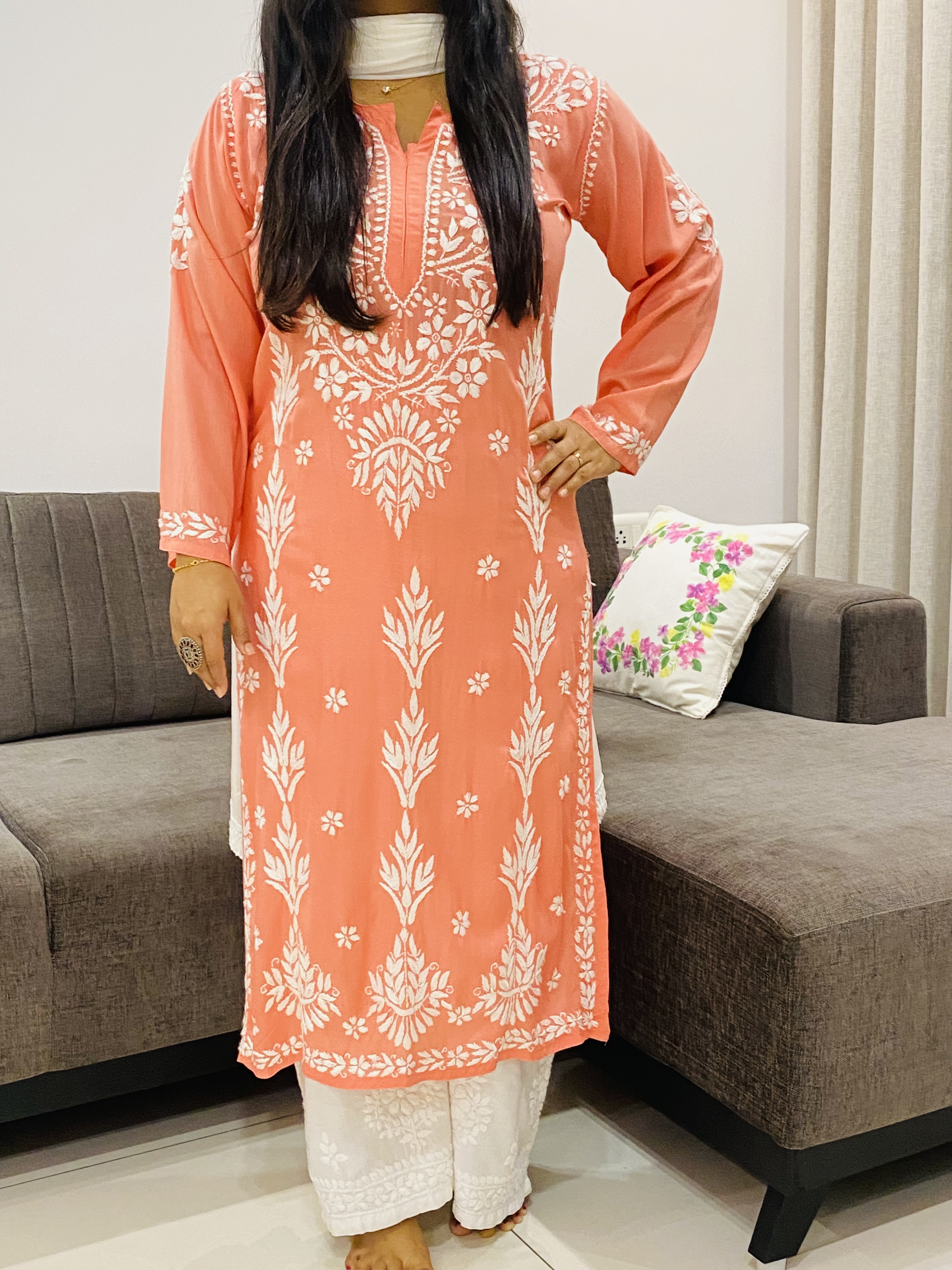 Peach Zareen Premium Modal Chikankari Solid Women's Long Kurta